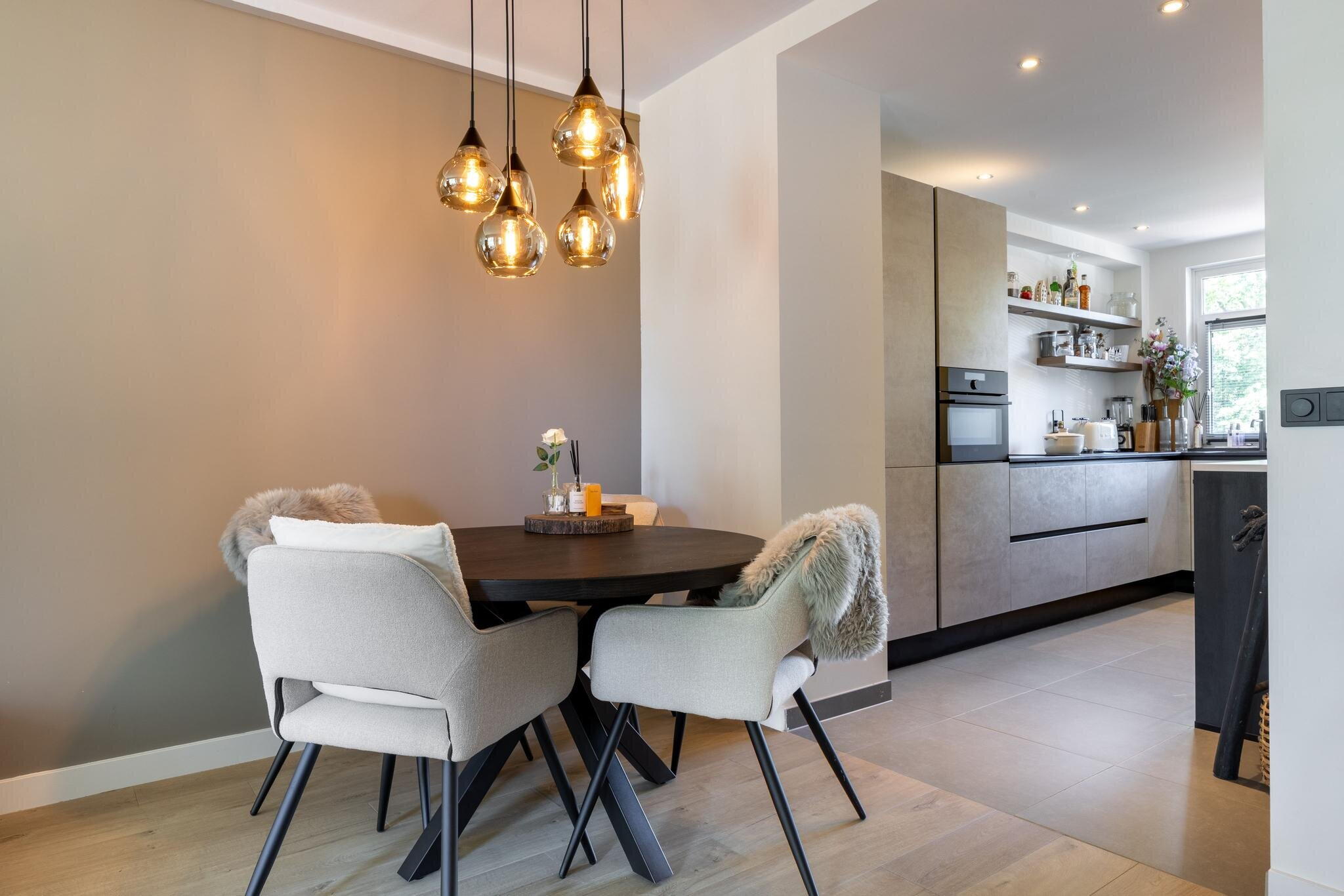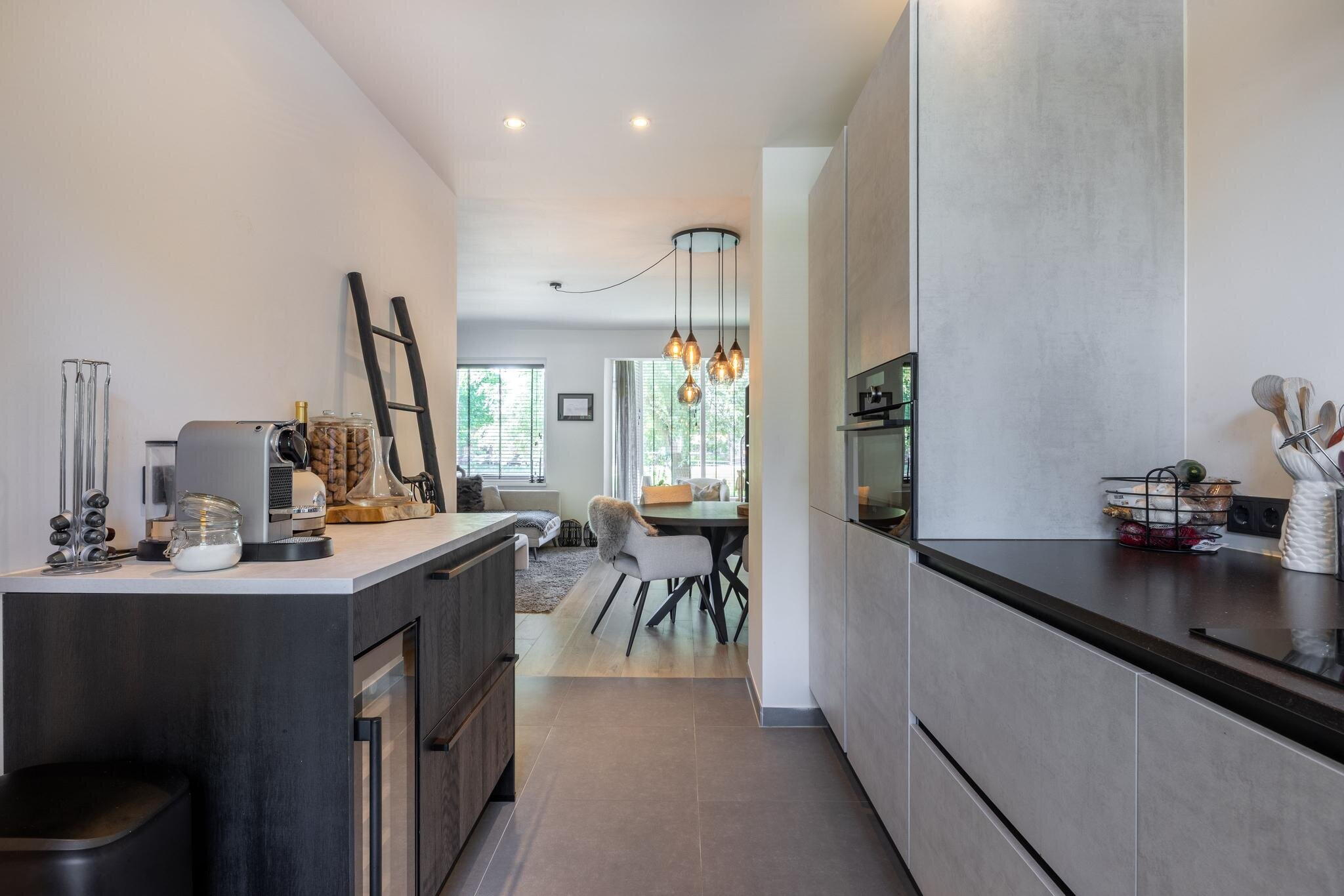 De moderne open keuken (ca. 4.56 x 2.34m) is in december 2022 geplaatst en beschikt over een wand- en een hoekopstelling met een composiet werkblad en diverse inbouwapparatuur waaronder een 4-pits Bora inductiekookplaat met geïntegreerde afzuiging, koelkast, vrieskast (3 laden), vaatwasser, combi oven/magnetron, een wijnkoeler en een rechte spoelbak.
