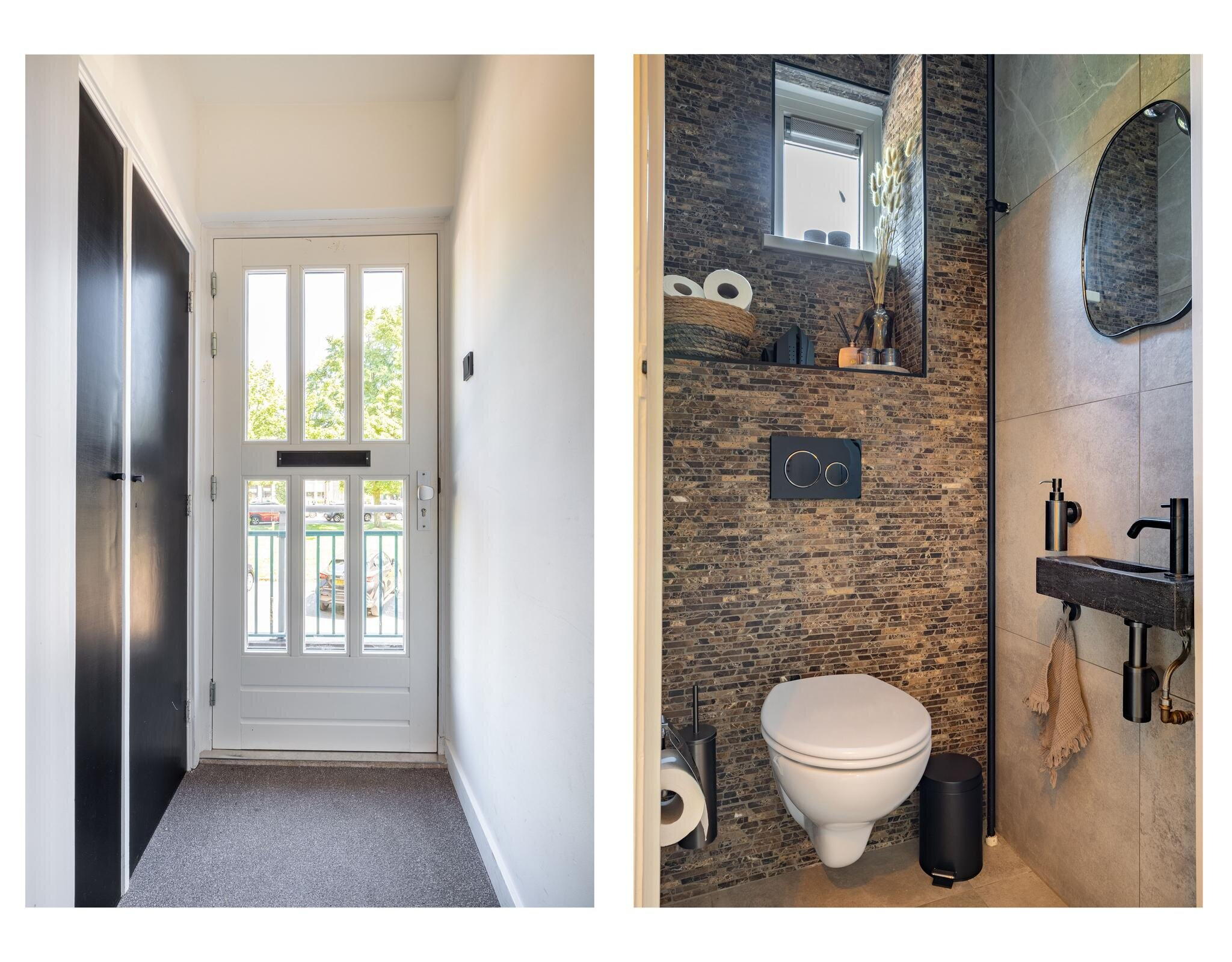 De vestibule met een vaste kast en de meterkast (11 groepen) geeft toegang tot de hal (ca. 3.26 x 2.09m) met de trapopgang naar de bovenste verdieping en de toiletruimte voorzien van een hangend closet met inbouwreservoir, een natuurstenen hoekfonteintje en een moderne tegelvloer- en wandafwerking. Vanuit de hal is er toegang tot de woonkamer.