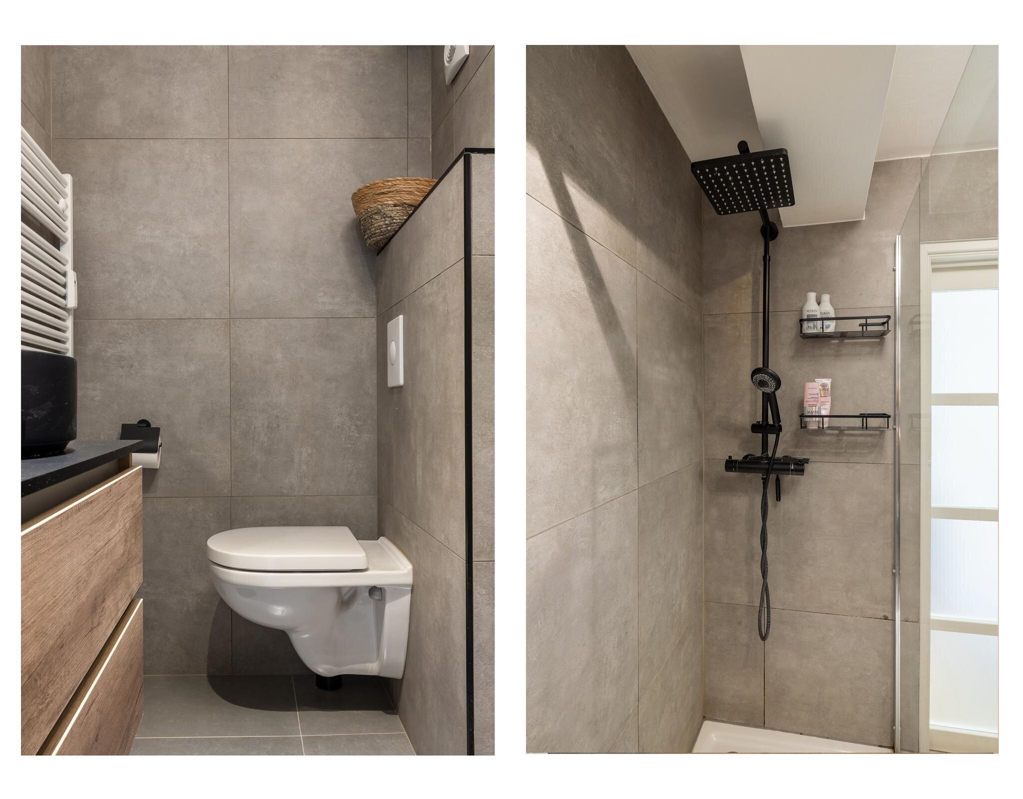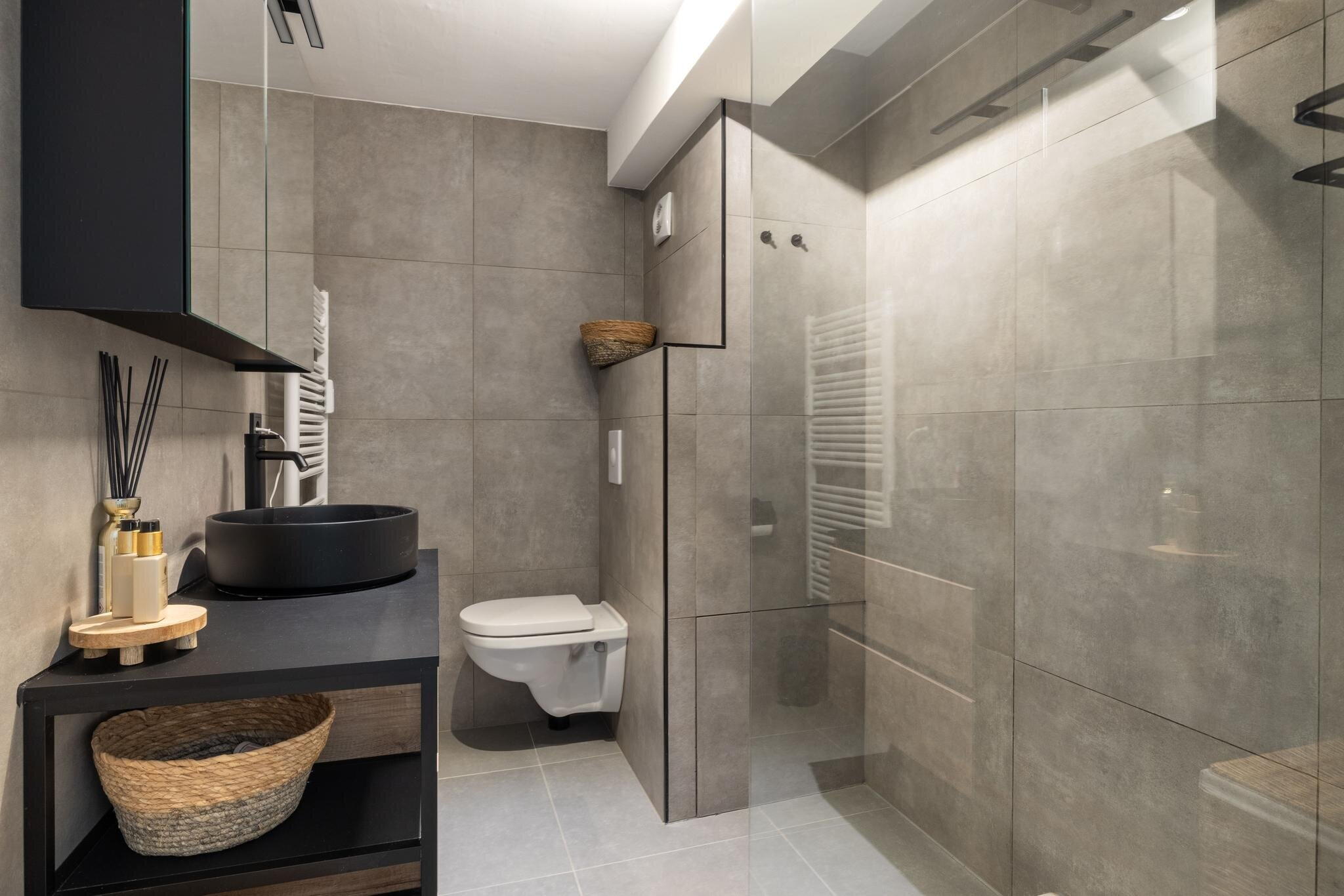 De prachtige badkamer (ca. 2.58 x 1.80m) is voorzien van een douche met een glazen douchewand, hand- en regendouche, een hangend closet met inbouwreservoir, komwastafel op meubel, designradiator, spiegelkast, mechanische ventilatie en is afgewerkt met een moderne grijze vloer- en wandtegel.