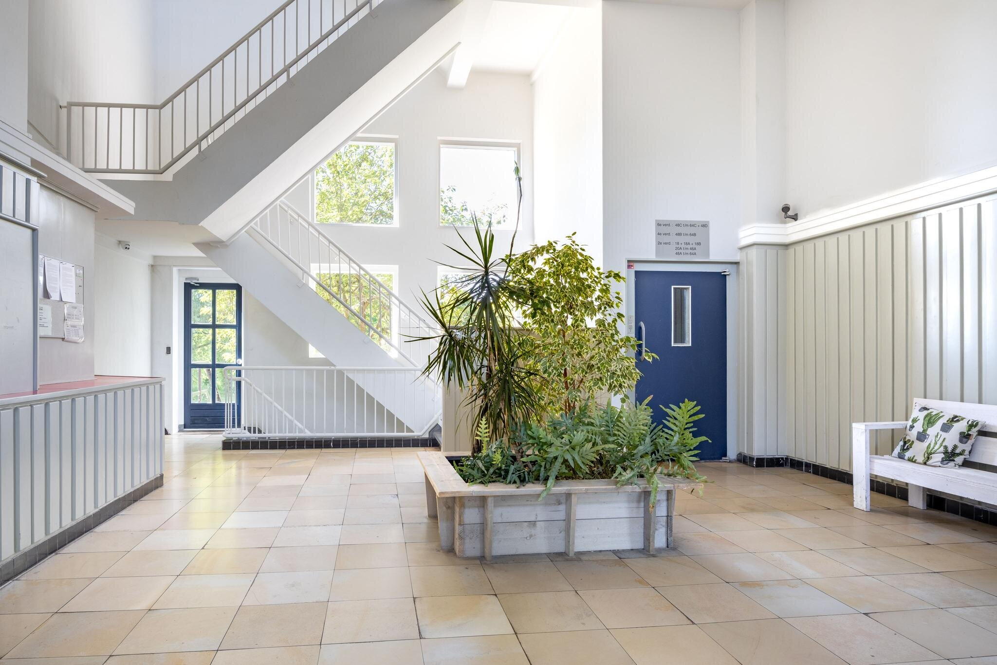 De centrale entree met het bellentableau en de brievenbussen geeft toegang tot de statige hal met het trappenhuis, de liftinstallatie en toegang tot een gezamenlijke fietsenstalling en de eigen berging (ca. 5.0 x 2.2m) voorzien van elektra.